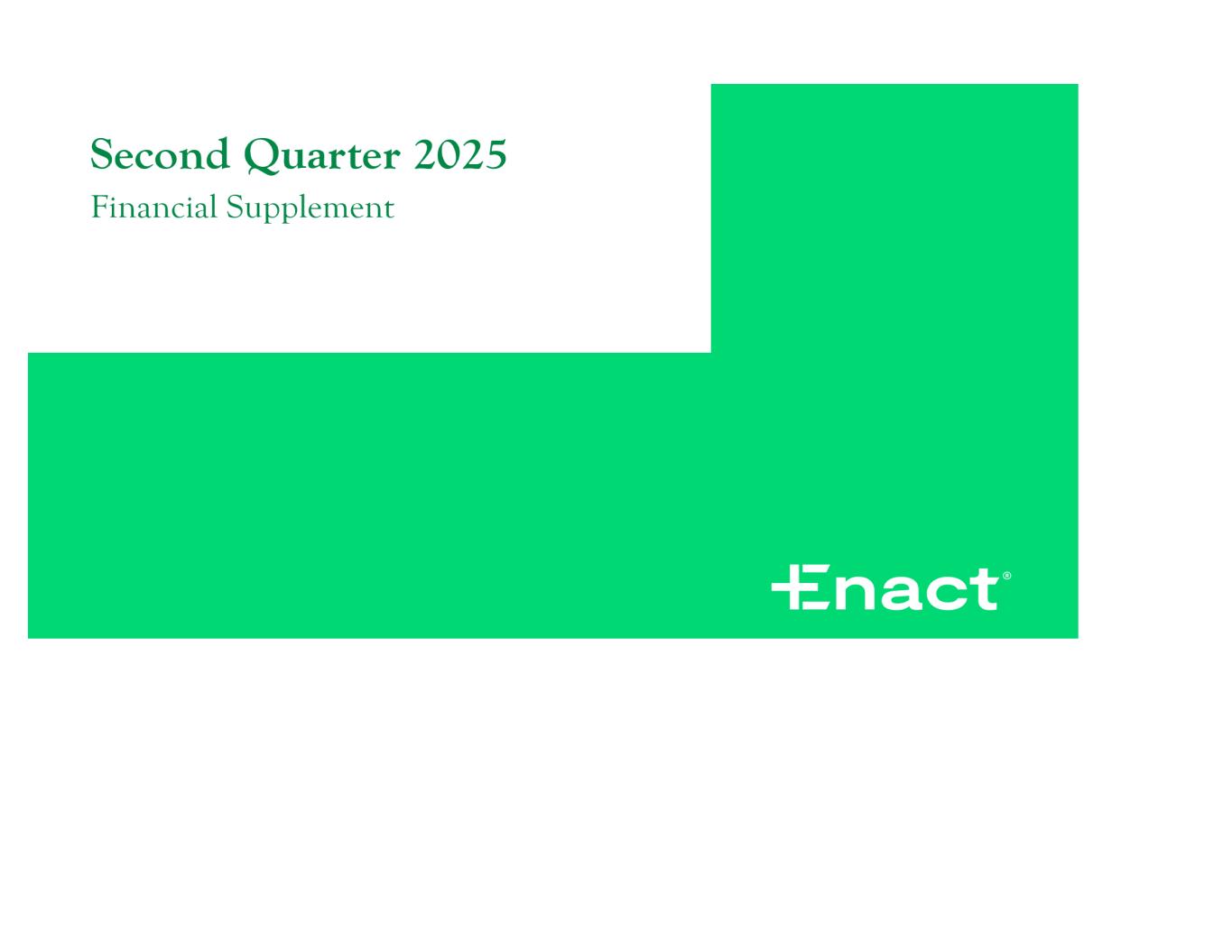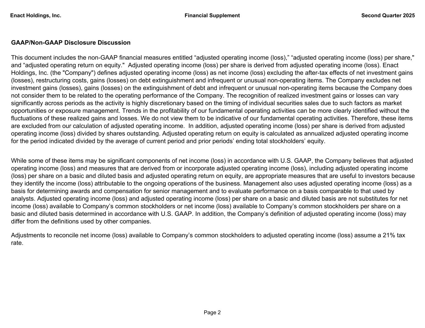Enact Holdings, Inc. Financial Supplement Second Quarter 2025 GAAP/Non-GAAP Disclosure Discussion This document includes the non-GAAP financial measures entitled “adjusted operating income (loss),” “adjusted operating income (loss) per share," and “adjusted operating return on equity." Adjusted operating income (loss) per share is derived from adjusted operating income (loss). Enact Holdings, Inc. (the "Company") defines adjusted operating income (loss) as net income (loss) excluding the after-tax effects of net investment gains (losses), restructuring costs, gains (losses) on debt extinguishment and infrequent or unusual non-operating items. The Company excludes net investment gains (losses), gains (losses) on the extinguishment of debt and infrequent or unusual non-operating items because the Company does not consider them to be related to the operating performance of the Company. The recognition of realized investment gains or losses can vary significantly across periods as the activity is highly discretionary based on the timing of individual securities sales due to such factors as market opportunities or exposure management. Trends in the profitability of our fundamental operating activities can be more clearly identified without the fluctuations of these realized gains and losses. We do not view them to be indicative of our fundamental operating activities. Therefore, these items are excluded from our calculation of adjusted operating income. In addition, adjusted operating income (loss) per share is derived from adjusted operating income (loss) divided by shares outstanding. Adjusted operating return on equity is calculated as annualized adjusted operating income for the period indicated divided by the average of current period and prior periods’ ending total stockholders’ equity. While some of these items may be significant components of net income (loss) in accordance with U.S. GAAP, the Company believes that adjusted operating income (loss) and measures that are derived from or incorporate adjusted operating income (loss), including adjusted operating income (loss) per share on a basic and diluted basis and adjusted operating return on equity, are appropriate measures that are useful to investors because they identify the income (loss) attributable to the ongoing operations of the business. Management also uses adjusted operating income (loss) as a basis for determining awards and compensation for senior management and to evaluate performance on a basis comparable to that used by analysts. Adjusted operating income (loss) and adjusted operating income (loss) per share on a basic and diluted basis are not substitutes for net income (loss) available to Company’s common stockholders or net income (loss) available to Company’s common stockholders per share on a basic and diluted basis determined in accordance with U.S. GAAP. In addition, the Company’s definition of adjusted operating income (loss) may differ from the definitions used by other companies. Adjustments to reconcile net income (loss) available to Company’s common stockholders to adjusted operating income (loss) assume a 21% tax rate. Page 2
