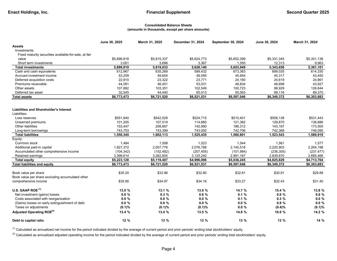 Enact Holdings, Inc. Financial Supplement Second Quarter 2025 June 30, 2025 March 31, 2025 December 31, 2024 September 30, 2024 June 30, 2024 March 31, 2024 Assets Investments: Fixed maturity securities available-for-sale, at fair value $5,896,818 $5,815,337 $5,624,773 $5,652,399 $5,331,345 $5,351,138 Short term investments 3,001 3,696 3,367 1,550 12,313 9,963 Total investments 5,899,819 5,819,033 5,628,140 5,653,949 5,343,658 5,361,101 Cash and cash equivalents 612,967 635,269 599,432 673,363 699,035 614,330 Accrued investment income 53,259 49,654 49,595 45,954 45,317 43,450 Deferred acquisition costs 22,910 23,322 23,771 24,160 24,619 24,861 Premiums receivable 44,091 46,451 53,031 48,834 48,698 43,927 Other assets 107,882 103,351 102,549 100,723 98,929 126,644 Deferred tax asset 32,545 44,440 65,013 50,063 89,116 89,370 Total assets $6,773,473 $6,721,520 $6,521,531 $6,597,046 $6,349,372 $6,303,683 Liabilities and Shareholder's Interest Liabilities: Loss reserves $551,940 $542,528 $524,715 $510,401 $508,138 $531,443 Unearned premiums 101,205 107,519 114,680 121,382 129,870 138,886 Other liabilities 153,447 208,667 142,990 186,312 143,167 173,500 Long-term borrowings 743,753 743,399 743,050 742,706 742,368 746,090 Total liabilities 1,550,345 1,602,113 1,525,435 1,560,801 1,523,543 1,589,919 Equity: Common stock 1,484 1,508 1,523 1,544 1,561 1,577 Additional paid-in capital 1,927,372 2,007,776 2,076,788 2,145,518 2,220,903 2,264,198 Accumulated other comprehensive income (104,342) (152,482) (207,455) (101,984) (236,305) (237,477) Retained earnings 3,398,614 3,262,605 3,125,240 2,991,167 2,839,670 2,685,466 Total equity $5,223,128 $5,119,407 $4,996,096 $5,036,245 $4,825,829 $4,713,764 Total liabilities and equity $6,773,473 $6,721,520 $6,521,531 $6,597,046 $6,349,372 $6,303,683 Book value per share $35.20 $33.96 $32.80 $32.61 $30.91 $29.89 Book value per share excluding accumulated other comprehensive income $35.90 $34.97 $34.16 $33.27 $32.43 $31.40 U.S. GAAP ROE (1) 13.0 % 13.1 % 13.0 % 14.7 % 15.4 % 13.8 % Net investment (gains) losses 0.6 % 0.3 % 0.6 % 0.1 % 0.6 % 0.6 % Costs associated with reorganization 0.0 % 0.0 % 0.0 % 0.1 % 0.3 % 0.0 % (Gains) losses on early extinguishment of debt 0.0 % 0.0 % 0.0 % 0.0 % 0.9 % 0.0 % Taxes on adjustments (0.1)% (0.1)% (0.1)% 0.0 % (0.4)% (0.1)% Adjusted Operating ROE(2) 13.4 % 13.4 % 13.5 % 14.8 % 16.9 % 14.2 % Debt to capital ratio 12 % 13 % 13 % 13 % 13 % 14 % (2) Calculated as annualized adjusted operating income for the period indicated divided by the average of current period and prior periods’ ending total stockholders’ equity. (1) Calculated as annualized net income for the period indicated divided by the average of current period and prior periods’ ending total stockholders’ equity. Consolidated Balance Sheets (amounts in thousands, except per share amounts) Page 4