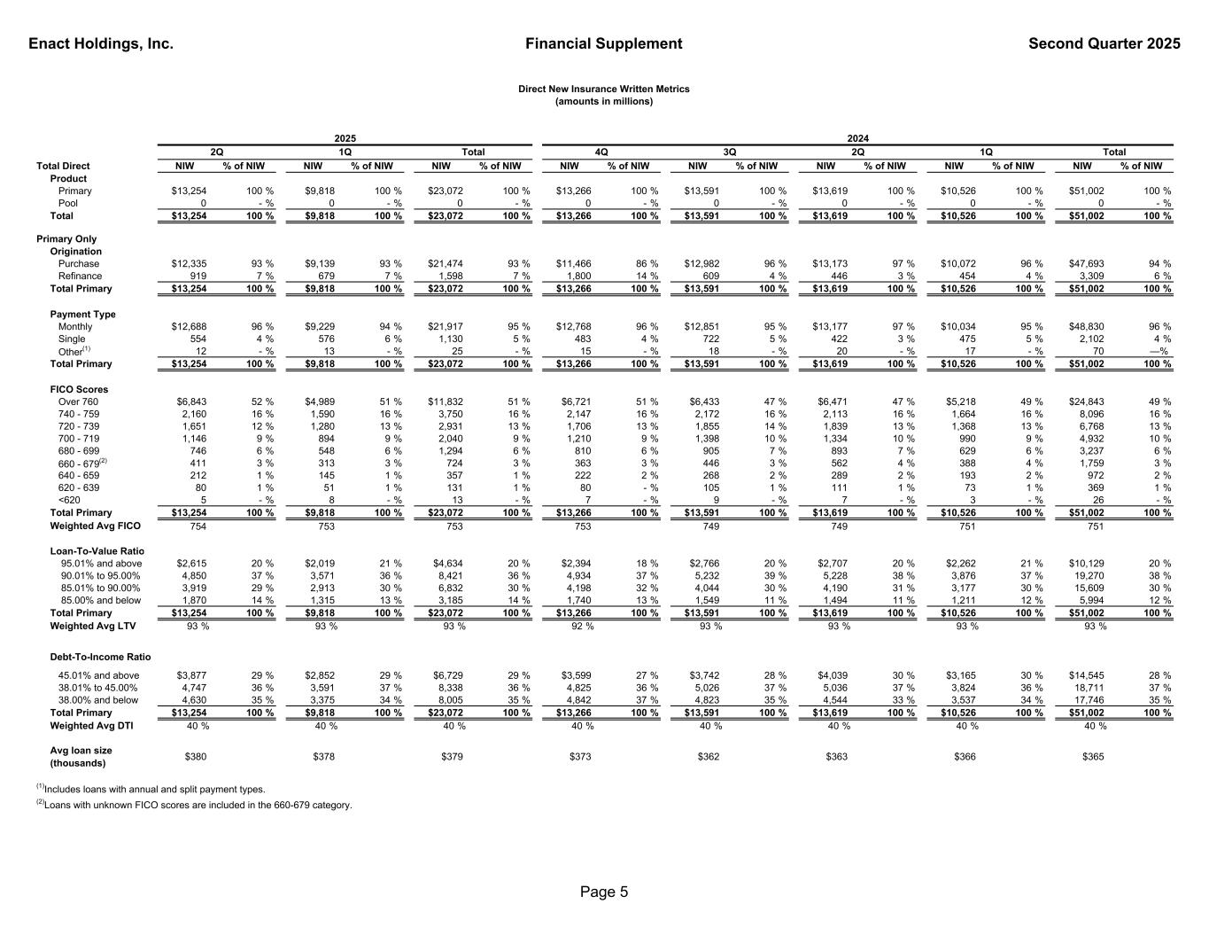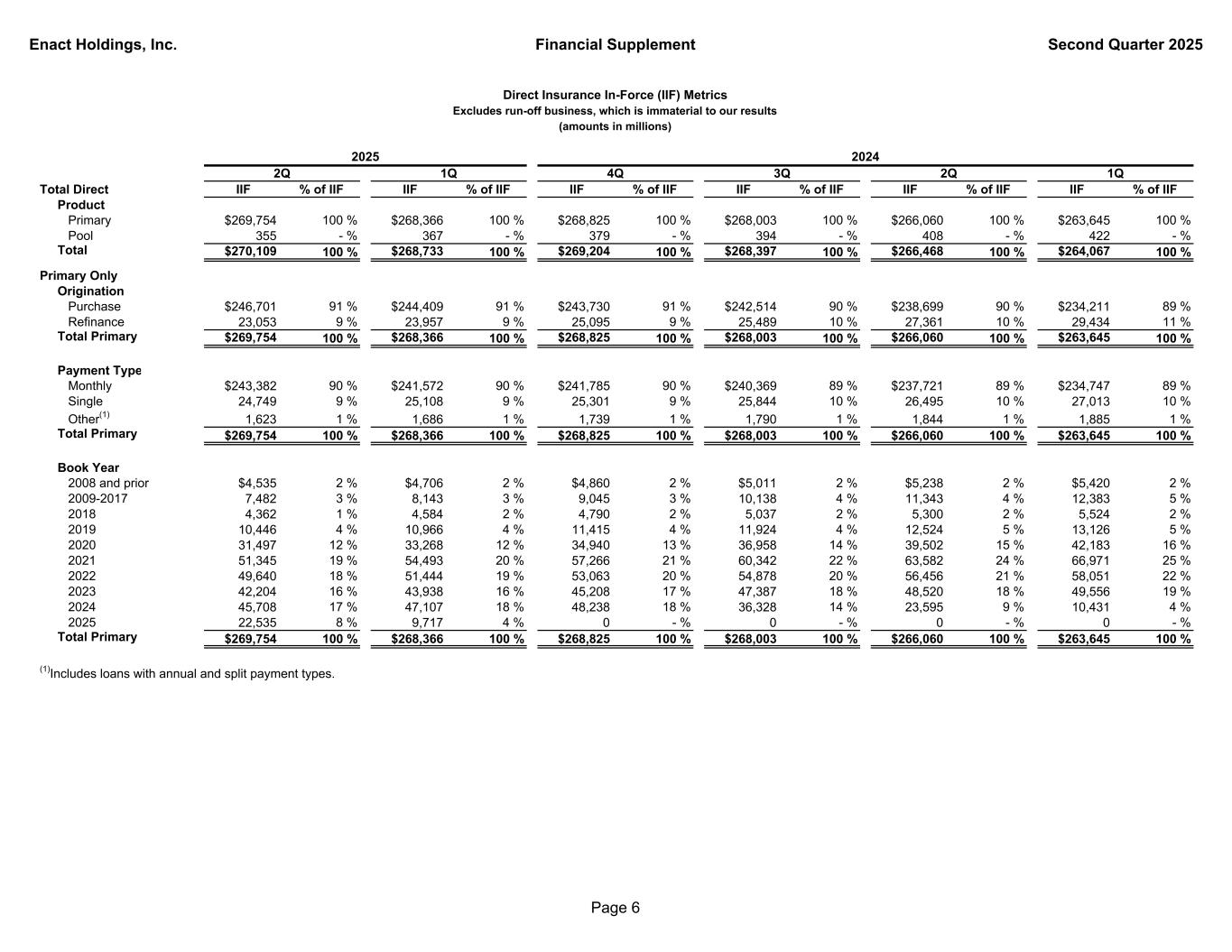 Enact Holdings, Inc. Financial Supplement Second Quarter 2025 Total Direct NIW % of NIW NIW % of NIW NIW % of NIW NIW % of NIW NIW % of NIW NIW % of NIW NIW % of NIW NIW % of NIW Product Primary $13,254 100 % $9,818 100 % $23,072 100 % $13,266 100 % $13,591 100 % $13,619 100 % $10,526 100 % $51,002 100 % Pool 0 - % 0 - % 0 - % 0 - % 0 - % 0 - % 0 - % 0 - % Total $13,254 100 % $9,818 100 % $23,072 100 % $13,266 100 % $13,591 100 % $13,619 100 % $10,526 100 % $51,002 100 % Primary Only Origination Purchase $12,335 93 % $9,139 93 % $21,474 93 % $11,466 86 % $12,982 96 % $13,173 97 % $10,072 96 % $47,693 94 % Refinance 919 7 % 679 7 % 1,598 7 % 1,800 14 % 609 4 % 446 3 % 454 4 % 3,309 6 % Total Primary $13,254 100 % $9,818 100 % $23,072 100 % $13,266 100 % $13,591 100 % $13,619 100 % $10,526 100 % $51,002 100 % Payment Type Monthly $12,688 96 % $9,229 94 % $21,917 95 % $12,768 96 % $12,851 95 % $13,177 97 % $10,034 95 % $48,830 96 % Single 554 4 % 576 6 % 1,130 5 % 483 4 % 722 5 % 422 3 % 475 5 % 2,102 4 % Other(1) 12 - % 13 - % 25 - % 15 - % 18 - % 20 - % 17 - % 70 —% Total Primary $13,254 100 % $9,818 100 % $23,072 100 % $13,266 100 % $13,591 100 % $13,619 100 % $10,526 100 % $51,002 100 % FICO Scores Over 760 $6,843 52 % $4,989 51 % $11,832 51 % $6,721 51 % $6,433 47 % $6,471 47 % $5,218 49 % $24,843 49 % 740 - 759 2,160 16 % 1,590 16 % 3,750 16 % 2,147 16 % 2,172 16 % 2,113 16 % 1,664 16 % 8,096 16 % 720 - 739 1,651 12 % 1,280 13 % 2,931 13 % 1,706 13 % 1,855 14 % 1,839 13 % 1,368 13 % 6,768 13 % 700 - 719 1,146 9 % 894 9 % 2,040 9 % 1,210 9 % 1,398 10 % 1,334 10 % 990 9 % 4,932 10 % 680 - 699 746 6 % 548 6 % 1,294 6 % 810 6 % 905 7 % 893 7 % 629 6 % 3,237 6 % 660 - 679(2) 411 3 % 313 3 % 724 3 % 363 3 % 446 3 % 562 4 % 388 4 % 1,759 3 % 640 - 659 212 1 % 145 1 % 357 1 % 222 2 % 268 2 % 289 2 % 193 2 % 972 2 % 620 - 639 80 1 % 51 1 % 131 1 % 80 - % 105 1 % 111 1 % 73 1 % 369 1 % <620 5 - % 8 - % 13 - % 7 - % 9 - % 7 - % 3 - % 26 - % Total Primary $13,254 100 % $9,818 100 % $23,072 100 % $13,266 100 % $13,591 100 % $13,619 100 % $10,526 100 % $51,002 100 % Weighted Avg FICO 754 753 753 753 749 749 751 751 Loan-To-Value Ratio 95.01% and above $2,615 20 % $2,019 21 % $4,634 20 % $2,394 18 % $2,766 20 % $2,707 20 % $2,262 21 % $10,129 20 % 90.01% to 95.00% 4,850 37 % 3,571 36 % 8,421 36 % 4,934 37 % 5,232 39 % 5,228 38 % 3,876 37 % 19,270 38 % 85.01% to 90.00% 3,919 29 % 2,913 30 % 6,832 30 % 4,198 32 % 4,044 30 % 4,190 31 % 3,177 30 % 15,609 30 % 85.00% and below 1,870 14 % 1,315 13 % 3,185 14 % 1,740 13 % 1,549 11 % 1,494 11 % 1,211 12 % 5,994 12 % Total Primary $13,254 100 % $9,818 100 % $23,072 100 % $13,266 100 % $13,591 100 % $13,619 100 % $10,526 100 % $51,002 100 % Weighted Avg LTV 93 % 93 % 93 % 92 % 93 % 93 % 93 % 93 % Debt-To-Income Ratio 45.01% and above $3,877 29 % $2,852 29 % $6,729 29 % $3,599 27 % $3,742 28 % $4,039 30 % $3,165 30 % $14,545 28 % 38.01% to 45.00% 4,747 36 % 3,591 37 % 8,338 36 % 4,825 36 % 5,026 37 % 5,036 37 % 3,824 36 % 18,711 37 % 38.00% and below 4,630 35 % 3,375 34 % 8,005 35 % 4,842 37 % 4,823 35 % 4,544 33 % 3,537 34 % 17,746 35 % Total Primary $13,254 100 % $9,818 100 % $23,072 100 % $13,266 100 % $13,591 100 % $13,619 100 % $10,526 100 % $51,002 100 % Weighted Avg DTI 40 % 40 % 40 % 40 % 40 % 40 % 40 % 40 % Avg loan size (thousands) $380 $378 $379 $373 $362 $363 $366 $365 (2)Loans with unknown FICO scores are included in the 660-679 category. (1)Includes loans with annual and split payment types. Direct New Insurance Written Metrics (amounts in millions) 3Q Total1Q2Q 2024 4QTotal1Q2Q 2025 Page 5