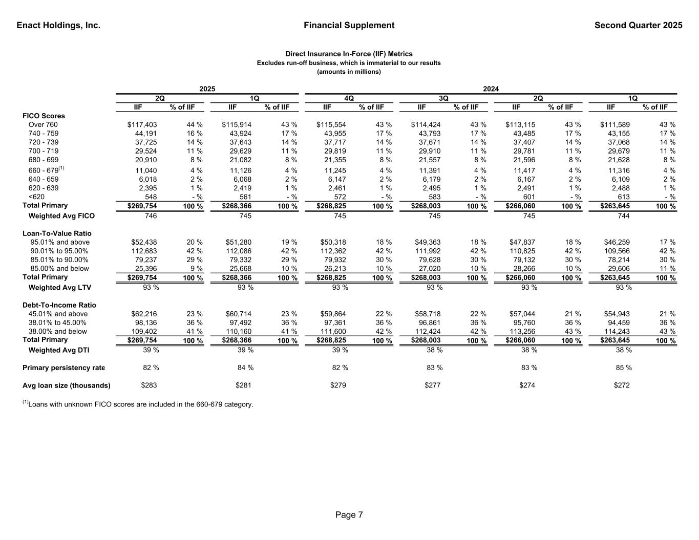 Enact Holdings, Inc. Financial Supplement Second Quarter 2025 Total Direct IIF % of IIF IIF % of IIF IIF % of IIF IIF % of IIF IIF % of IIF IIF % of IIF Product Primary $269,754 100 % $268,366 100 % $268,825 100 % $268,003 100 % $266,060 100 % $263,645 100 % Pool 355 - % 367 - % 379 - % 394 - % 408 - % 422 - % Total $270,109 100 % $268,733 100 % $269,204 100 % $268,397 100 % $266,468 100 % $264,067 100 % Primary Only Origination Purchase $246,701 91 % $244,409 91 % $243,730 91 % $242,514 90 % $238,699 90 % $234,211 89 % Refinance 23,053 9 % 23,957 9 % 25,095 9 % 25,489 10 % 27,361 10 % 29,434 11 % Total Primary $269,754 100 % $268,366 100 % $268,825 100 % $268,003 100 % $266,060 100 % $263,645 100 % Payment Type Monthly $243,382 90 % $241,572 90 % $241,785 90 % $240,369 89 % $237,721 89 % $234,747 89 % Single 24,749 9 % 25,108 9 % 25,301 9 % 25,844 10 % 26,495 10 % 27,013 10 % Other(1) 1,623 1 % 1,686 1 % 1,739 1 % 1,790 1 % 1,844 1 % 1,885 1 % Total Primary $269,754 100 % $268,366 100 % $268,825 100 % $268,003 100 % $266,060 100 % $263,645 100 % Book Year 2008 and prior $4,535 2 % $4,706 2 % $4,860 2 % $5,011 2 % $5,238 2 % $5,420 2 % 2009-2017 7,482 3 % 8,143 3 % 9,045 3 % 10,138 4 % 11,343 4 % 12,383 5 % 2018 4,362 1 % 4,584 2 % 4,790 2 % 5,037 2 % 5,300 2 % 5,524 2 % 2019 10,446 4 % 10,966 4 % 11,415 4 % 11,924 4 % 12,524 5 % 13,126 5 % 2020 31,497 12 % 33,268 12 % 34,940 13 % 36,958 14 % 39,502 15 % 42,183 16 % 2021 51,345 19 % 54,493 20 % 57,266 21 % 60,342 22 % 63,582 24 % 66,971 25 % 2022 49,640 18 % 51,444 19 % 53,063 20 % 54,878 20 % 56,456 21 % 58,051 22 % 2023 42,204 16 % 43,938 16 % 45,208 17 % 47,387 18 % 48,520 18 % 49,556 19 % 2024 45,708 17 % 47,107 18 % 48,238 18 % 36,328 14 % 23,595 9 % 10,431 4 % 2025 22,535 8 % 9,717 4 % 0 - % 0 - % 0 - % 0 - % Total Primary $269,754 100 % $268,366 100 % $268,825 100 % $268,003 100 % $266,060 100 % $263,645 100 % (1)Includes loans with annual and split payment types. 4Q 3Q1Q Direct Insurance In-Force (IIF) Metrics Excludes run-off business, which is immaterial to our results (amounts in millions) 1Q 2024 2Q2Q 2025 Page 6