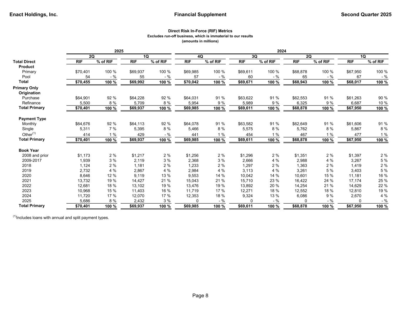 Enact Holdings, Inc. Financial Supplement Second Quarter 2025 IIF % of IIF IIF % of IIF IIF % of IIF IIF % of IIF IIF % of IIF IIF % of IIF FICO Scores Over 760 $117,403 44 % $115,914 43 % $115,554 43 % $114,424 43 % $113,115 43 % $111,589 43 % 740 - 759 44,191 16 % 43,924 17 % 43,955 17 % 43,793 17 % 43,485 17 % 43,155 17 % 720 - 739 37,725 14 % 37,643 14 % 37,717 14 % 37,671 14 % 37,407 14 % 37,068 14 % 700 - 719 29,524 11 % 29,629 11 % 29,819 11 % 29,910 11 % 29,781 11 % 29,679 11 % 680 - 699 20,910 8 % 21,082 8 % 21,355 8 % 21,557 8 % 21,596 8 % 21,628 8 % 660 - 679(1) 11,040 4 % 11,126 4 % 11,245 4 % 11,391 4 % 11,417 4 % 11,316 4 % 640 - 659 6,018 2 % 6,068 2 % 6,147 2 % 6,179 2 % 6,167 2 % 6,109 2 % 620 - 639 2,395 1 % 2,419 1 % 2,461 1 % 2,495 1 % 2,491 1 % 2,488 1 % <620 548 - % 561 - % 572 - % 583 - % 601 - % 613 - % Total Primary $269,754 100 % $268,366 100 % $268,825 100 % $268,003 100 % $266,060 100 % $263,645 100 % Weighted Avg FICO 746 745 745 745 745 744 Loan-To-Value Ratio 95.01% and above $52,438 20 % $51,280 19 % $50,318 18 % $49,363 18 % $47,837 18 % $46,259 17 % 90.01% to 95.00% 112,683 42 % 112,086 42 % 112,362 42 % 111,992 42 % 110,825 42 % 109,566 42 % 85.01% to 90.00% 79,237 29 % 79,332 29 % 79,932 30 % 79,628 30 % 79,132 30 % 78,214 30 % 85.00% and below 25,396 9 % 25,668 10 % 26,213 10 % 27,020 10 % 28,266 10 % 29,606 11 % Total Primary $269,754 100 % $268,366 100 % $268,825 100 % $268,003 100 % $266,060 100 % $263,645 100 % Weighted Avg LTV 93 % 93 % 93 % 93 % 93 % 93 % Debt-To-Income Ratio 45.01% and above $62,216 23 % $60,714 23 % $59,864 22 % $58,718 22 % $57,044 21 % $54,943 21 % 38.01% to 45.00% 98,136 36 % 97,492 36 % 97,361 36 % 96,861 36 % 95,760 36 % 94,459 36 % 38.00% and below 109,402 41 % 110,160 41 % 111,600 42 % 112,424 42 % 113,256 43 % 114,243 43 % Total Primary $269,754 100 % $268,366 100 % $268,825 100 % $268,003 100 % $266,060 100 % $263,645 100 % Weighted Avg DTI 39 % 39 % 39 % 38 % 38 % 38 % Primary persistency rate 82 % 84 % 82 % 83 % 83 % 85 % Avg loan size (thousands) $283 $281 $279 $277 $274 $272 (1)Loans with unknown FICO scores are included in the 660-679 category. 4Q1Q Direct Insurance In-Force (IIF) Metrics Excludes run-off business, which is immaterial to our results (amounts in millions) 1Q2Q 2024 3Q2Q 2025 Page 7