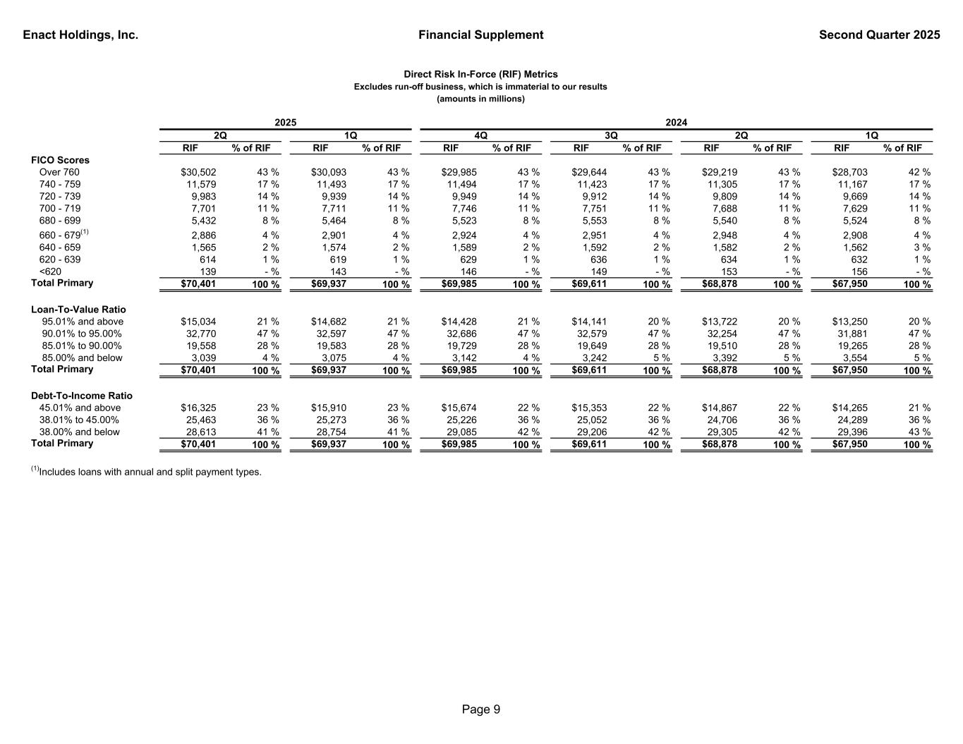 Enact Holdings, Inc. Financial Supplement Second Quarter 2025 Total Direct RIF % of RIF RIF % of RIF RIF % of RIF RIF % of RIF RIF % of RIF RIF % of RIF Product Primary $70,401 100 % $69,937 100 % $69,985 100 % $69,611 100 % $68,878 100 % $67,950 100 % Pool 54 - % 55 - % 57 - % 60 - % 65 - % 67 - % Total $70,455 100 % $69,992 100 % $70,042 100 % $69,671 100 % $68,943 100 % $68,017 100 % Primary Only Origination Purchase $64,901 92 % $64,228 92 % $64,031 91 % $63,622 91 % $62,553 91 % $61,263 90 % Refinance 5,500 8 % 5,709 8 % 5,954 9 % 5,989 9 % 6,325 9 % 6,687 10 % Total Primary $70,401 100 % $69,937 100 % $69,985 100 % $69,611 100 % $68,878 100 % $67,950 100 % Payment Type Monthly $64,676 92 % $64,113 92 % $64,078 91 % $63,582 91 % $62,649 91 % $61,606 91 % Single 5,311 7 % 5,395 8 % 5,466 8 % 5,575 8 % 5,762 8 % 5,867 8 % Other(1) 414 1 % 429 - % 441 1 % 454 1 % 467 1 % 477 1 % Total Primary $70,401 100 % $69,937 100 % $69,985 100 % $69,611 100 % $68,878 100 % $67,950 100 % Book Year 2008 and prior $1,173 2 % $1,217 2 % $1,256 2 % $1,296 2 % $1,351 2 % $1,397 2 % 2009-2017 1,939 3 % 2,119 3 % 2,368 3 % 2,666 4 % 2,988 4 % 3,267 5 % 2018 1,124 2 % 1,181 2 % 1,233 2 % 1,297 2 % 1,363 2 % 1,419 2 % 2019 2,732 4 % 2,867 4 % 2,984 4 % 3,113 4 % 3,261 5 % 3,403 5 % 2020 8,646 12 % 9,119 13 % 9,553 14 % 10,042 14 % 10,601 15 % 11,181 16 % 2021 13,732 19 % 14,427 21 % 15,043 21 % 15,710 23 % 16,422 24 % 17,174 25 % 2022 12,681 18 % 13,102 19 % 13,476 19 % 13,892 20 % 14,254 21 % 14,629 22 % 2023 10,968 15 % 11,403 16 % 11,719 17 % 12,271 18 % 12,552 18 % 12,810 19 % 2024 11,720 17 % 12,070 17 % 12,353 18 % 9,324 13 % 6,086 9 % 2,670 4 % 2025 5,686 8 % 2,432 3 % 0 - % 0 - % 0 - % 0 - % Total Primary $70,401 100 % $69,937 100 % $69,985 100 % $69,611 100 % $68,878 100 % $67,950 100 % (1)Includes loans with annual and split payment types. Direct Risk In-Force (RIF) Metrics Excludes run-off business, which is immaterial to our results (amounts in millions) 1Q2Q4Q 3Q 2024 1Q2Q 2025 Page 8