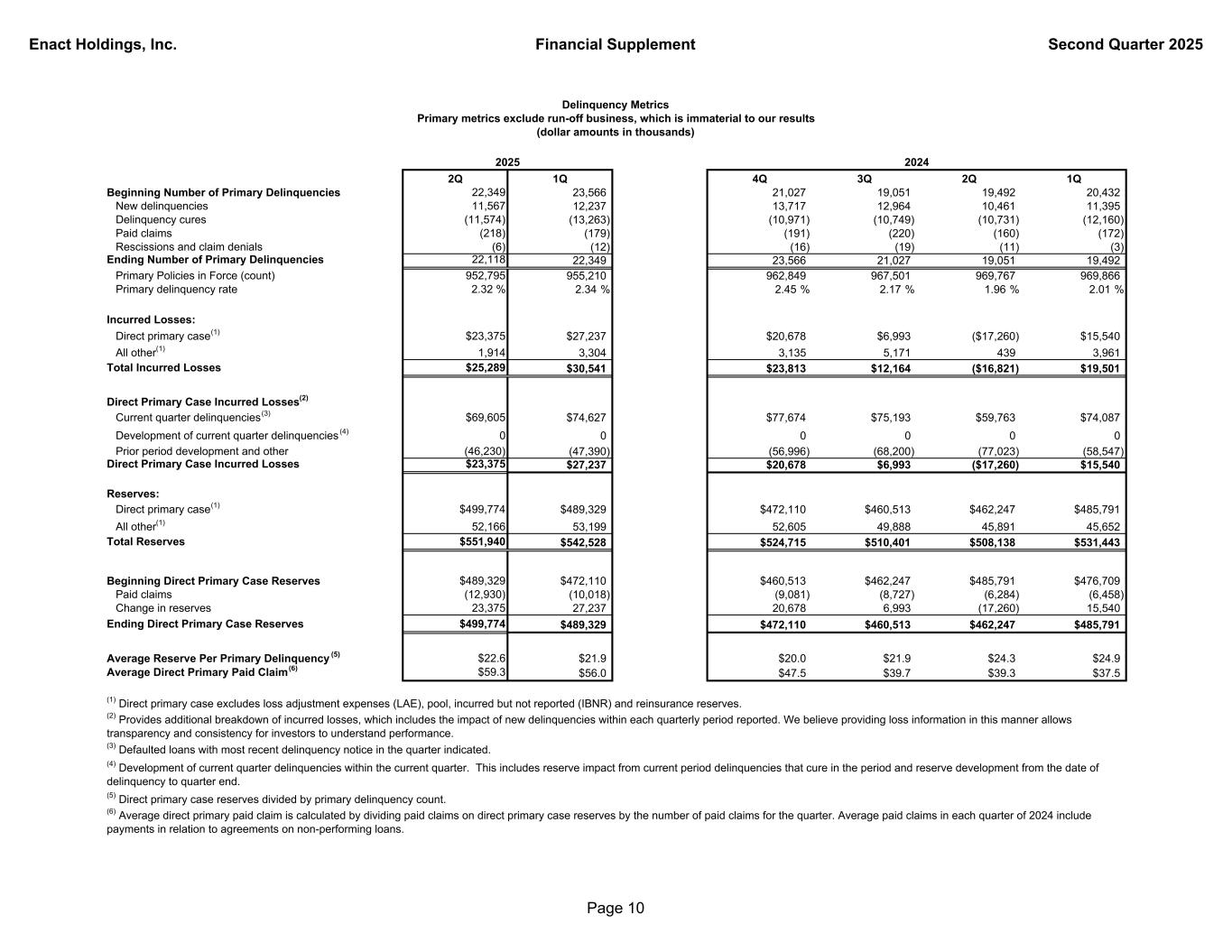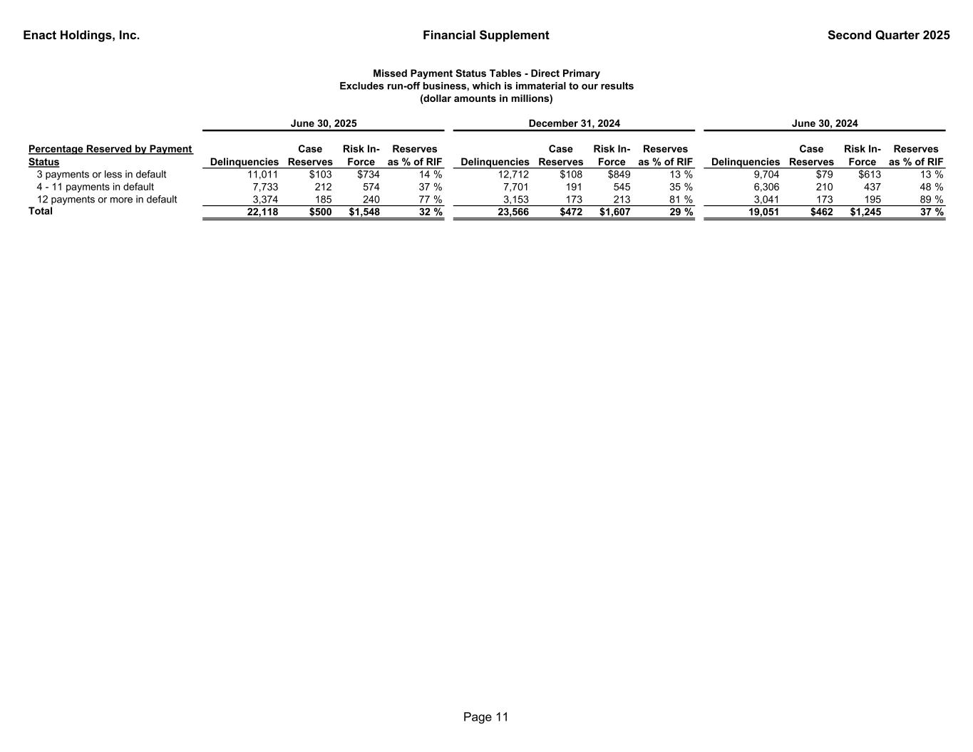 Enact Holdings, Inc. Financial Supplement Second Quarter 2025 2Q 1Q 4Q 3Q 2Q 1Q Beginning Number of Primary Delinquencies 22,349 23,566 21,027 19,051 19,492 20,432 New delinquencies 11,567 12,237 13,717 12,964 10,461 11,395 Delinquency cures (11,574) (13,263) (10,971) (10,749) (10,731) (12,160) Paid claims (218) (179) (191) (220) (160) (172) Rescissions and claim denials (6) (12) (16) (19) (11) (3) Ending Number of Primary Delinquencies 22,118 22,349 23,566 21,027 19,051 19,492 Primary Policies in Force (count) 952,795 955,210 962,849 967,501 969,767 969,866 Primary delinquency rate 2.32 % 2.34 % 2.45 % 2.17 % 1.96 % 2.01 % Incurred Losses: Direct primary case(1) $23,375 $27,237 $20,678 $6,993 ($17,260) $15,540 All other(1) 1,914 3,304 3,135 5,171 439 3,961 Total Incurred Losses $25,289 $30,541 $23,813 $12,164 ($16,821) $19,501 Direct Primary Case Incurred Losses(2) Current quarter delinquencies(3) $69,605 $74,627 $77,674 $75,193 $59,763 $74,087 Development of current quarter delinquencies (4) 0 0 0 0 0 0 Prior period development and other (46,230) (47,390) (56,996) (68,200) (77,023) (58,547) Direct Primary Case Incurred Losses $23,375 $27,237 $20,678 $6,993 ($17,260) $15,540 Reserves: Direct primary case(1) $499,774 $489,329 $472,110 $460,513 $462,247 $485,791 All other(1) 52,166 53,199 52,605 49,888 45,891 45,652 Total Reserves $551,940 $542,528 $524,715 $510,401 $508,138 $531,443 Beginning Direct Primary Case Reserves $489,329 $472,110 $460,513 $462,247 $485,791 $476,709 Paid claims (12,930) (10,018) (9,081) (8,727) (6,284) (6,458) Change in reserves 23,375 27,237 20,678 6,993 (17,260) 15,540 Ending Direct Primary Case Reserves $499,774 $489,329 $472,110 $460,513 $462,247 $485,791 Average Reserve Per Primary Delinquency (5) $22.6 $21.9 $20.0 $21.9 $24.3 $24.9 Average Direct Primary Paid Claim (6) $59.3 $56.0 $47.5 $39.7 $39.3 $37.5 Delinquency Metrics Primary metrics exclude run-off business, which is immaterial to our results (dollar amounts in thousands) 2024 (5) Direct primary case reserves divided by primary delinquency count. 2025 (6) Average direct primary paid claim is calculated by dividing paid claims on direct primary case reserves by the number of paid claims for the quarter. Average paid claims in each quarter of 2024 include payments in relation to agreements on non-performing loans. (2) Provides additional breakdown of incurred losses, which includes the impact of new delinquencies within each quarterly period reported. We believe providing loss information in this manner allows transparency and consistency for investors to understand performance. (3) Defaulted loans with most recent delinquency notice in the quarter indicated. (1) Direct primary case excludes loss adjustment expenses (LAE), pool, incurred but not reported (IBNR) and reinsurance reserves. (4) Development of current quarter delinquencies within the current quarter. This includes reserve impact from current period delinquencies that cure in the period and reserve development from the date of delinquency to quarter end. Page 10