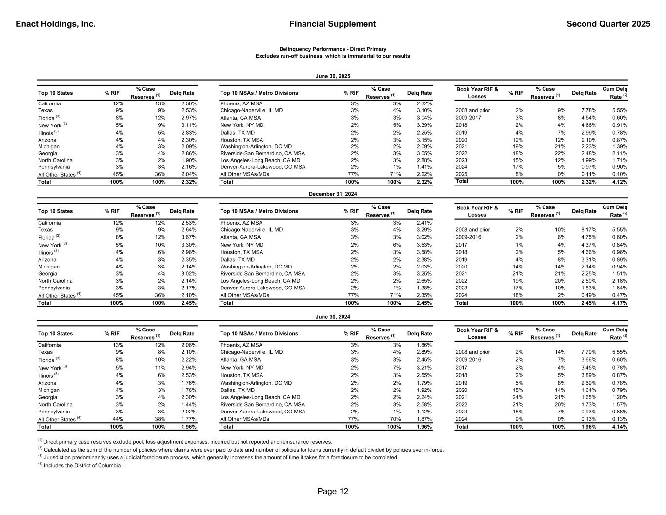 Enact Holdings, Inc. Financial Supplement Second Quarter 2025 Percentage Reserved by Payment Status Delinquencies Case Reserves Risk In- Force Reserves as % of RIF Delinquencies Case Reserves Risk In- Force Reserves as % of RIF Delinquencies Case Reserves Risk In- Force Reserves as % of RIF 3 payments or less in default 11,011 $103 $734 14 % 12,712 $108 $849 13 % 9,704 $79 $613 13 % 4 - 11 payments in default 7,733 212 574 37 % 7,701 191 545 35 % 6,306 210 437 48 % 12 payments or more in default 3,374 185 240 77 % 3,153 173 213 81 % 3,041 173 195 89 % Total 22,118 $500 $1,548 32 % 23,566 $472 $1,607 29 % 19,051 $462 $1,245 37 % June 30, 2025 Missed Payment Status Tables - Direct Primary Excludes run-off business, which is immaterial to our results (dollar amounts in millions) December 31, 2024 June 30, 2024 Page 11