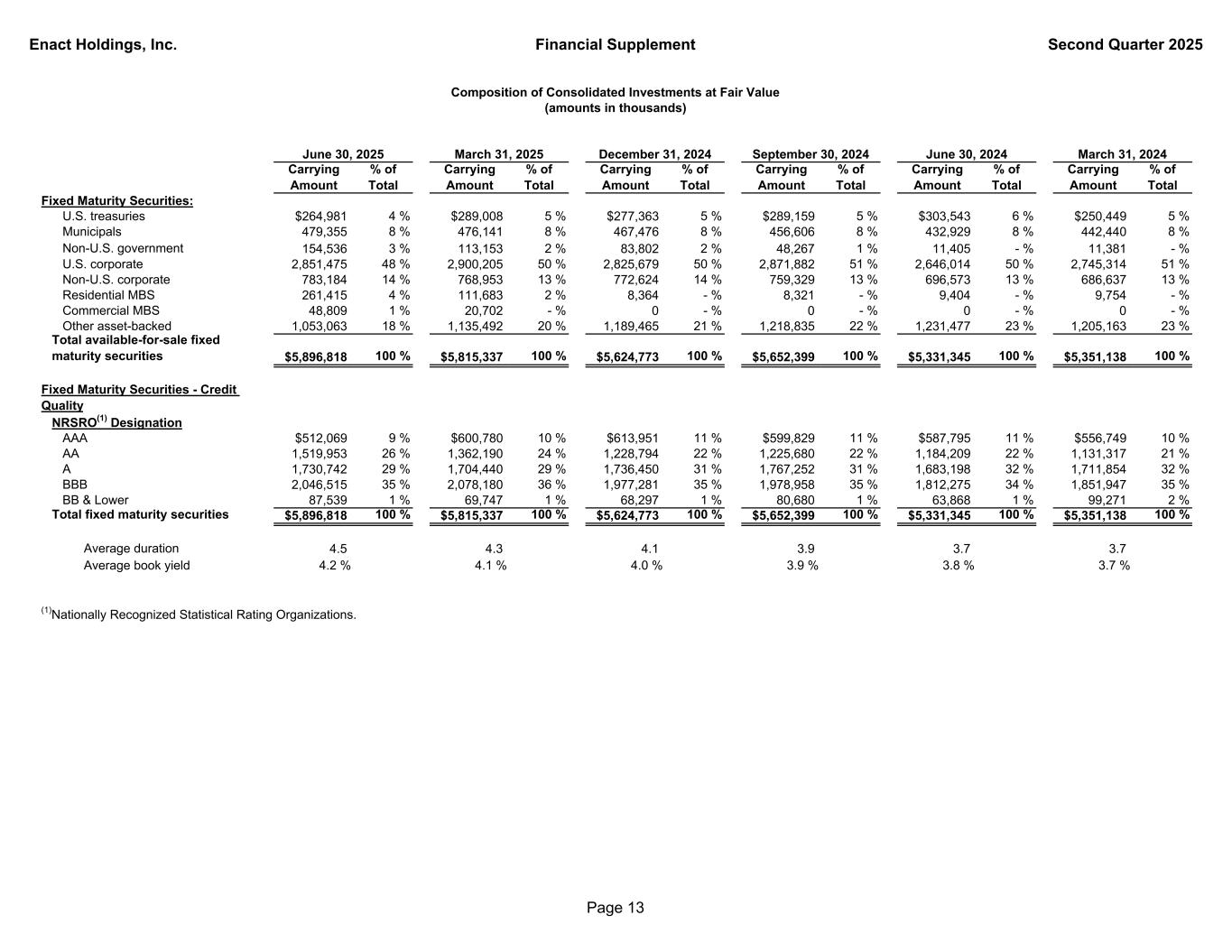 Enact Holdings, Inc. Financial Supplement Second Quarter 2025 Carrying Amount % of Total Carrying Amount % of Total Carrying Amount % of Total Carrying Amount % of Total Carrying Amount % of Total Carrying Amount % of Total Fixed Maturity Securities: U.S. treasuries $264,981 4 % $289,008 5 % $277,363 5 % $289,159 5 % $303,543 6 % $250,449 5 % Municipals 479,355 8 % 476,141 8 % 467,476 8 % 456,606 8 % 432,929 8 % 442,440 8 % Non-U.S. government 154,536 3 % 113,153 2 % 83,802 2 % 48,267 1 % 11,405 - % 11,381 - % U.S. corporate 2,851,475 48 % 2,900,205 50 % 2,825,679 50 % 2,871,882 51 % 2,646,014 50 % 2,745,314 51 % Non-U.S. corporate 783,184 14 % 768,953 13 % 772,624 14 % 759,329 13 % 696,573 13 % 686,637 13 % Residential MBS 261,415 4 % 111,683 2 % 8,364 - % 8,321 - % 9,404 - % 9,754 - % Commercial MBS 48,809 1 % 20,702 - % 0 - % 0 - % 0 - % 0 - % Other asset-backed 1,053,063 18 % 1,135,492 20 % 1,189,465 21 % 1,218,835 22 % 1,231,477 23 % 1,205,163 23 % Total available-for-sale fixed maturity securities $5,896,818 100 % $5,815,337 100 % $5,624,773 100 % $5,652,399 100 % $5,331,345 100 % $5,351,138 100 % Fixed Maturity Securities - Credit Quality NRSRO(1) Designation AAA $512,069 9 % $600,780 10 % $613,951 11 % $599,829 11 % $587,795 11 % $556,749 10 % AA 1,519,953 26 % 1,362,190 24 % 1,228,794 22 % 1,225,680 22 % 1,184,209 22 % 1,131,317 21 % A 1,730,742 29 % 1,704,440 29 % 1,736,450 31 % 1,767,252 31 % 1,683,198 32 % 1,711,854 32 % BBB 2,046,515 35 % 2,078,180 36 % 1,977,281 35 % 1,978,958 35 % 1,812,275 34 % 1,851,947 35 % BB & Lower 87,539 1 % 69,747 1 % 68,297 1 % 80,680 1 % 63,868 1 % 99,271 2 % Total fixed maturity securities $5,896,818 100 % $5,815,337 100 % $5,624,773 100 % $5,652,399 100 % $5,331,345 100 % $5,351,138 100 % Average duration 4.5 4.3 4.1 3.9 3.7 3.7 Average book yield 4.2 % 4.1 % 4.0 % 3.9 % 3.8 % 3.7 % (1)Nationally Recognized Statistical Rating Organizations. December 31, 2024 September 30, 2024 Composition of Consolidated Investments at Fair Value (amounts in thousands) March 31, 2024June 30, 2024March 31, 2025June 30, 2025 Page 13