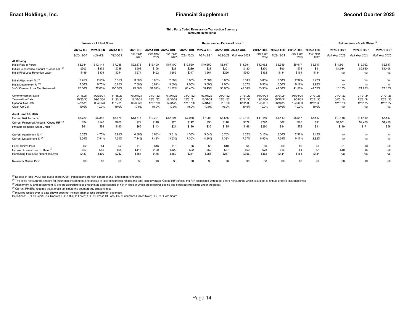 Enact Holdings, Inc. Financial Supplement Second Quarter 2025 2021-2 ILN 2021-3 ILN 2023-1 ILN 2021 XOL 2022-1 XOL 2022-2 XOL 2022-3 XOL 2022-4 XOL 2022-5 XOL 2023-1 XOL 2024-1 XOL 2024-2 XOL 2025-1 XOL 2025-2 XOL 2023-1 QSR 2024-1 QSR 2025-1 QSR 9/20-12/20 1/21-6/21 7/22-6/23 Full Year 2021 Full Year 2022 Full Year 2022 7/21-12/21 7/21-12/21 1/22-6/22 Full Year 2023 Full Year 2024 7/23-12/23 Full Year 2025 Full Year 2025 Full Year 2023 Full Year 2024 Full Year 2025 At Closing Initial Risk In-Force $8,384 $12,141 $7,288 $22,373 $15,400 $15,400 $10,550 $10,550 $8,547 $11,991 $12,062 $5,349 $5,517 $5,517 $11,991 $12,062 $5,517 Initial Reinsurance Amount / Ceded RIF (2) $303 $372 $248 $206 $196 $25 $289 $36 $201 $180 $270 $90 $75 $11 $1,934 $2,560 $1,498 Initial First Loss Retention Layer $189 $304 $244 $671 $462 $385 $317 $264 $256 $360 $362 $134 $161 $134 n/a n/a n/a Initial Attachment % (3) 2.25% 2.50% 3.35% 3.00% 3.00% 2.50% 3.00% 2.50% 3.00% 3.00% 3.00% 2.50% 2.92% 2.42% n/a n/a n/a Initial Detachment % (3) 7.00% 6.75% 6.75% 7.00% 6.99% 3.00% 7.00% 3.00% 7.00% 6.57% 6.50% 6.50% 6.17% 2.92% n/a n/a n/a % Of Covered Loss Tier Reinsured 76.00% 72.00% 100.00% 23.00% 31.92% 31.92% 68.45% 68.45% 58.80% 42.00% 63.96% 41.88% 41.58% 41.59% 16.13% 21.23% 27.15% Commencement Date 04/16/21 09/02/21 11/15/23 01/01/21 01/01/22 01/01/22 03/01/22 03/01/22 09/01/22 01/01/23 01/01/24 06/01/24 01/01/25 01/01/25 04/01/23 01/01/24 01/01/25 Termination Date 10/25/33 02/25/34 11/25/33 12/31/31 12/31/32 12/31/32 12/31/31 12/31/31 12/31/32 12/31/33 12/31/34 06/30/34 12/31/35 12/31/35 04/01/34 12/31/34 12/31/35 Optional Call Date 04/25/28 08/25/28 11/27/28 06/30/28 12/31/29 12/31/29 12/31/28 12/31/28 01/01/30 12/31/30 12/31/31 06/30/29 12/31/30 12/31/30 12/31/26 12/31/27 12/31/27 Clean-Up Call 10.0% 10.0% 10.0% 10.0% 10.0% 10.0% 10.0% 10.0% 10.0% 10.0% 10.0% 10.0% 10.0% 10.0% n/a n/a n/a As of June 30, 2025 Current Risk In-Force $3,720 $6,312 $6,178 $13,614 $12,291 $12,291 $7,088 $7,088 $6,566 $10,118 $11,449 $4,449 $5,517 $5,517 $10,118 $11,449 $5,517 Current Reinsured Amount / Ceded RIF (2) $94 $140 $206 $72 $148 $25 $142 $36 $140 $172 $270 $87 $75 $11 $1,631 $2,430 $1,498 PMIERs Required Asset Credit (4) $61 $98 $190 $69 $143 $24 $136 $35 $135 $166 $260 $84 $72 $11 $119 $171 $96 Current Attachment % (3) 5.02% 4.75% 3.91% 4.86% 3.63% 3.01% 4.38% 3.64% 3.76% 3.52% 3.16% 3.00% 2.92% 2.42% n/a n/a n/a Current Detachment % (3) 8.34% 7.84% 7.25% 7.14% 7.42% 3.63% 7.30% 4.38% 7.39% 7.57% 6.85% 7.68% 6.17% 2.92% n/a n/a n/a Enact Claims Paid $2 $4 $2 $10 $16 $16 $6 $6 $10 $4 $0 $0 $0 $0 $1 $0 $0 Incurred Losses Ever To Date (5) $27 $48 $65 $115 $120 $120 $62 $62 $67 $60 $23 $16 $1 $1 $10 $5 $0 Remaining First Loss Retention Layer $187 $300 $242 $661 $446 $369 $311 $258 $247 $356 $362 $134 $161 $134 n/a n/a n/a Reinsurer Claims Paid $0 $0 $0 $0 $0 $0 $0 $0 $0 $0 $0 $0 $0 $0 $0 $0 $0 Third Party Ceded Reinsurance Transaction Summary (amounts in millions) (1) Excess of loss (XOL) and quota share (QSR) transactions are with panels of U.S. and global reinsurers. (2) The initial reinsurance amount for insurance linked notes and excess of loss reinsurance reflects the total loss coverage; Ceded RIF reflects the RIF associated with quota share reinsurance which is subject to annual and life loss ratio limits. (3) Attachment % and detachment % are the aggregate loss amounts as a percentage of risk in force at which the reinsurer begins and stops paying claims under the policy. (4) Current PMIERs required asset credit considers the counterparty credit haircut. (5) Incurred losses ever to date shown does not include IBNR or loss adjustment expenses. Definitions: CRT = Credit Risk Transfer; RIF = Risk In Force; XOL = Excess Of Loss; ILN = Insurance Linked Note; QSR = Quota Share Reinsurance - Excess of Loss (1) Reinsurance - Quota Share (1)Insurance Linked Notes Page 14